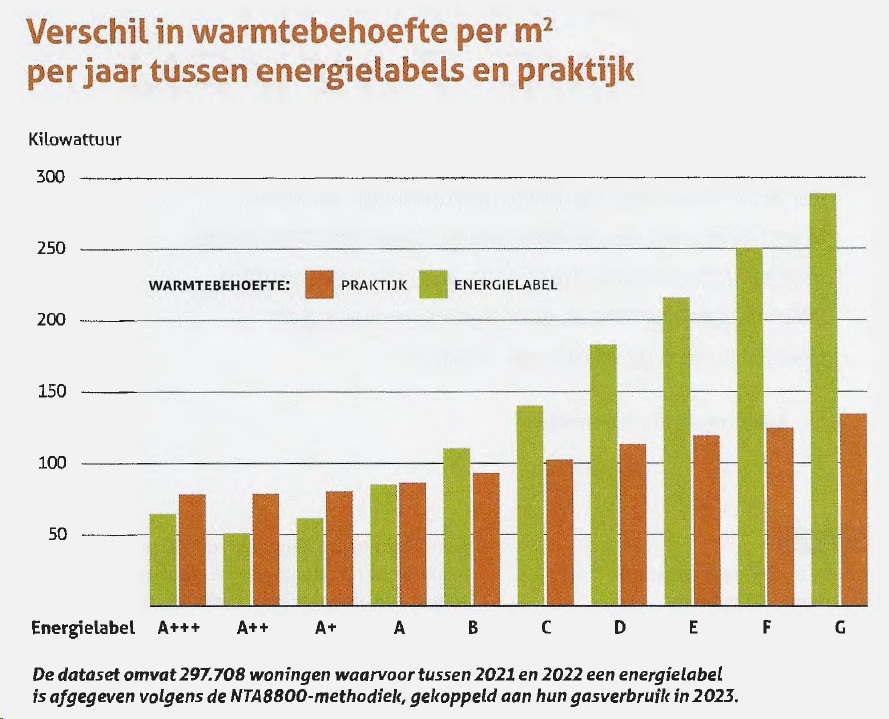 Voor 2021 werden energielabels berekend met de NEN7120-methode. Uit het nderzoek Energielabels en werkelljl< energiegebruik van de TU Delft was al bekend dat die slecht aansloot bij de praktijk. Met de introductie van de NTA8800 in 2021 hoopte men op verbetering. Maar de kloof tussen de theoretische warmtebehoefte (label) en het werkelijke aardgasverbruik (data) per vierkante meter voor NTA8800-woningen blijft aanzienlijk (zie grafiek).