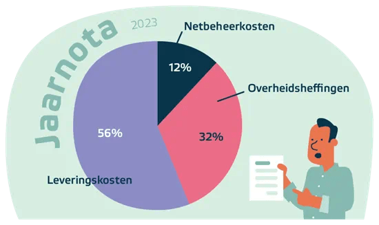 Het laatste onderdeel van je energietarief zijn belastingen: de overheidsheffingen en btw. Deze dragen wij rechtstreeks af aan de overheid. De overheidsheffingen kunnen jaarlijks per 1 januari wijzigen.