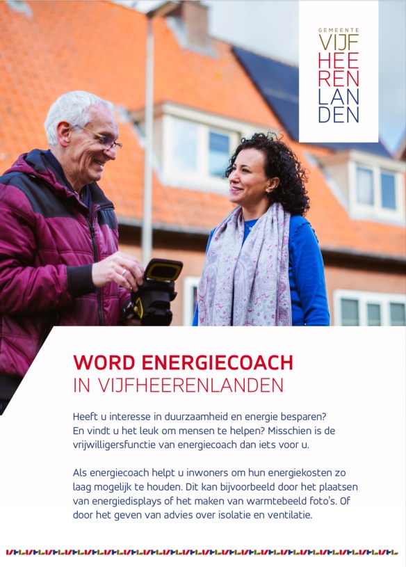 Gemeente Vijfheerenlanden komt graag in contact met personen m/v die energiecoach willen worden. Als je praktisch kan denken en met mensen kan omgaan komt dat goed. Je wordt door de andere energecoaces ingewerkt en mag een opleiding volgen. Natuurlijk ontvangen de coaches een vrijwilligersvergoeding.