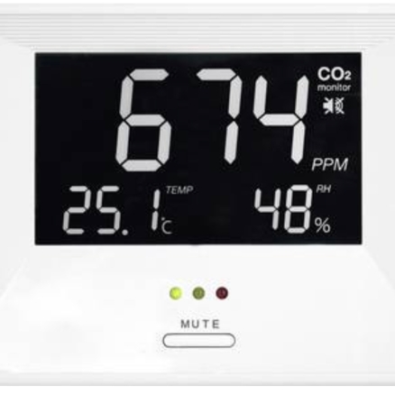 De eenheid van CO2 is PPM (parts per million, deeltjes per miljoen). Dit is de verhouding van CO2-waarden in de omgevingslucht. De CO2-waarden zijn te meten met een CO2-monitor. In dit voorbeeld is de CO2-waarde 674 PPM. Dit meetinstrument geeft ook de temperatuur en de relatieve vochtigheidsgraad aan.