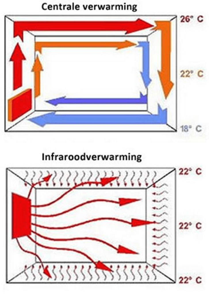 Infrarood panelen (afgekort IR-panelen) kunnen vergeleken worden met de warmtestraling van de zon. Wanneer je in de straalrichting van de panelen staat ontvangt je de warmte, maar wanneer je buiten de stralingsrichting staat ontvang je geen warmte.