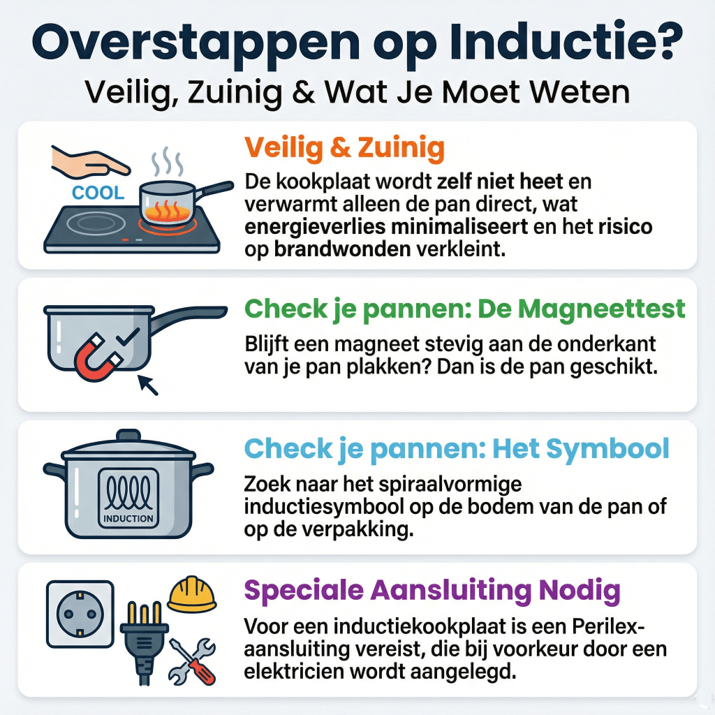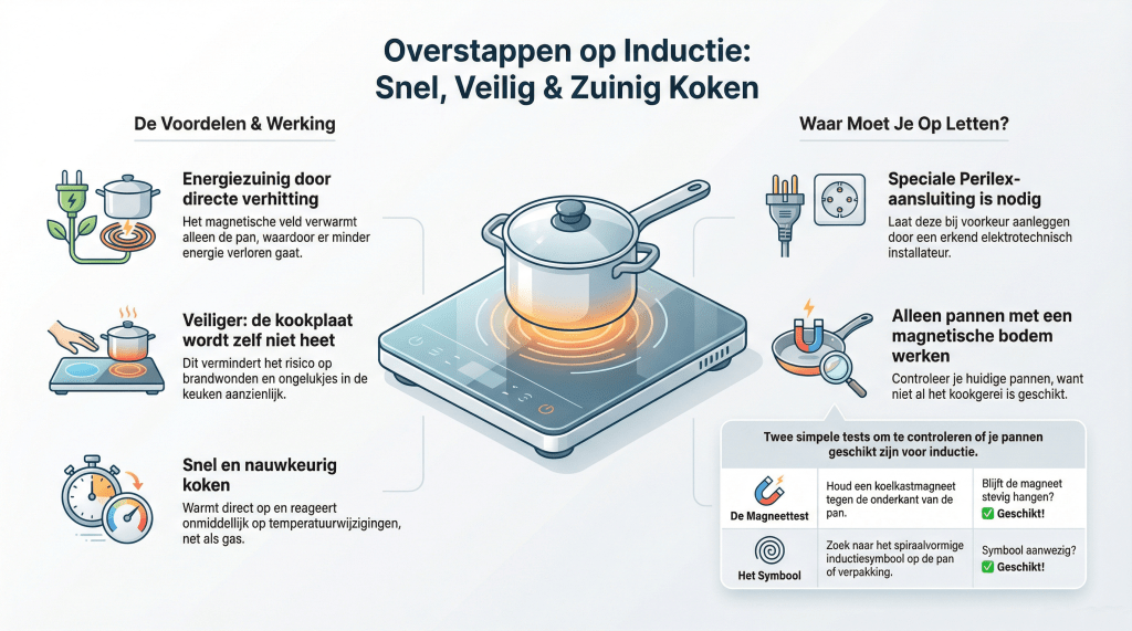 Koken met inductie is een efficiënte en veilige manier van elektrisch koken waarbij de pan direct wordt verwarmd door een magnetisch veld. De kookplaat wordt zelf niet heet, wat het risico op verbranden vermindert en zorgt voor snellere opwarm- en afkoeltijden.