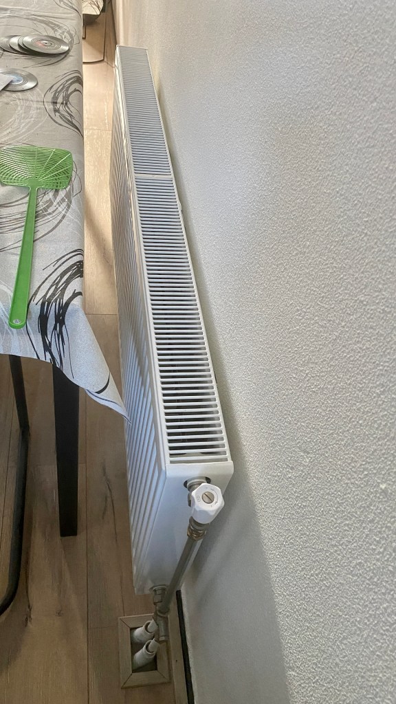 Op deze foto zie je een radiator die op een buitenmuur is gemonteerd. Er is nog geen radiatorfolie aangebracht.